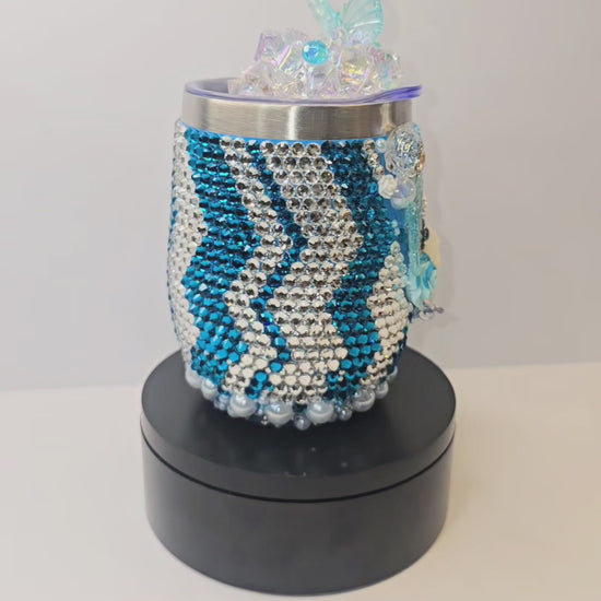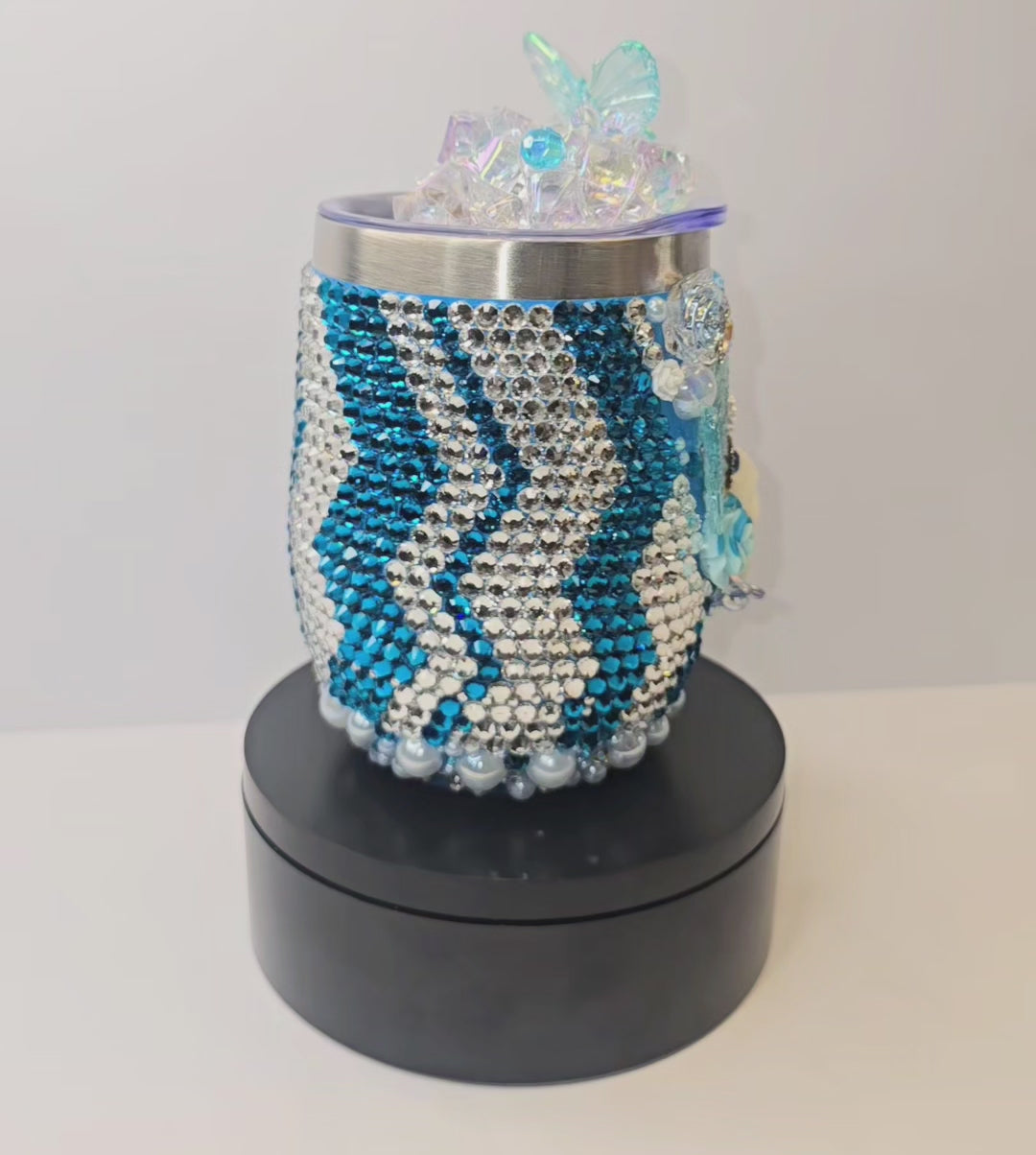 One-of-a-kind luxury rhinestone tumbler featuring an icy blue sparkle base with dimensional butterflies, florals, pearls, and crystal embellishments.